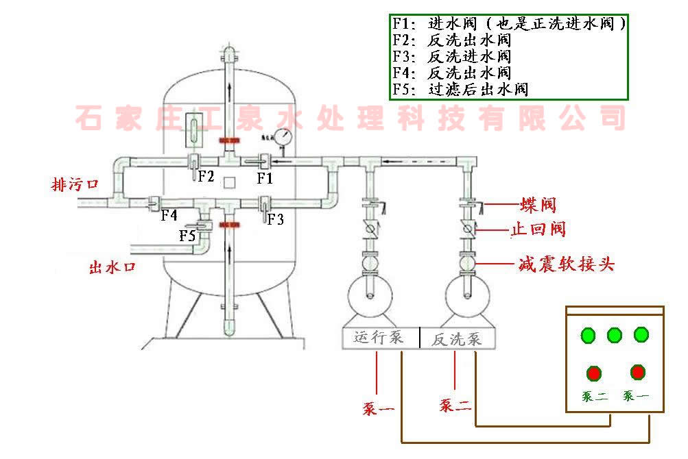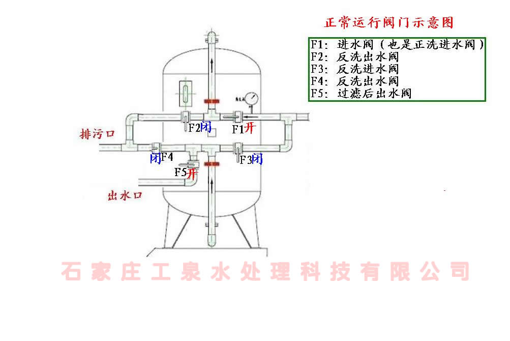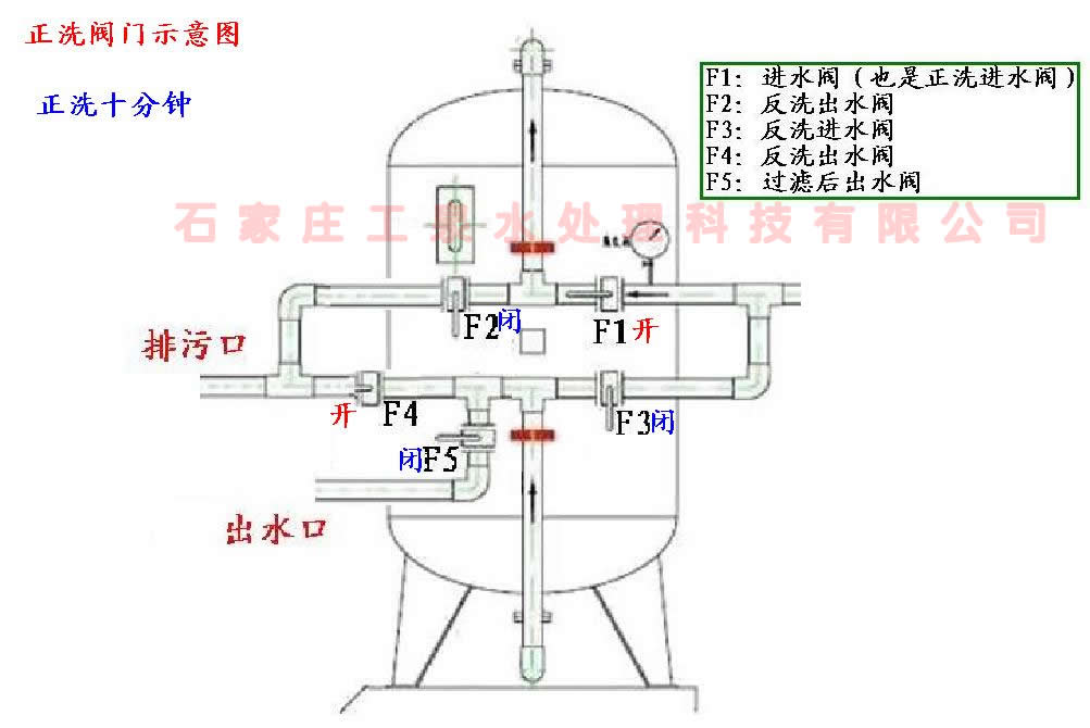五口(石英砂過(guò)濾器)砂濾器正洗反洗閥門(mén)操作示意圖